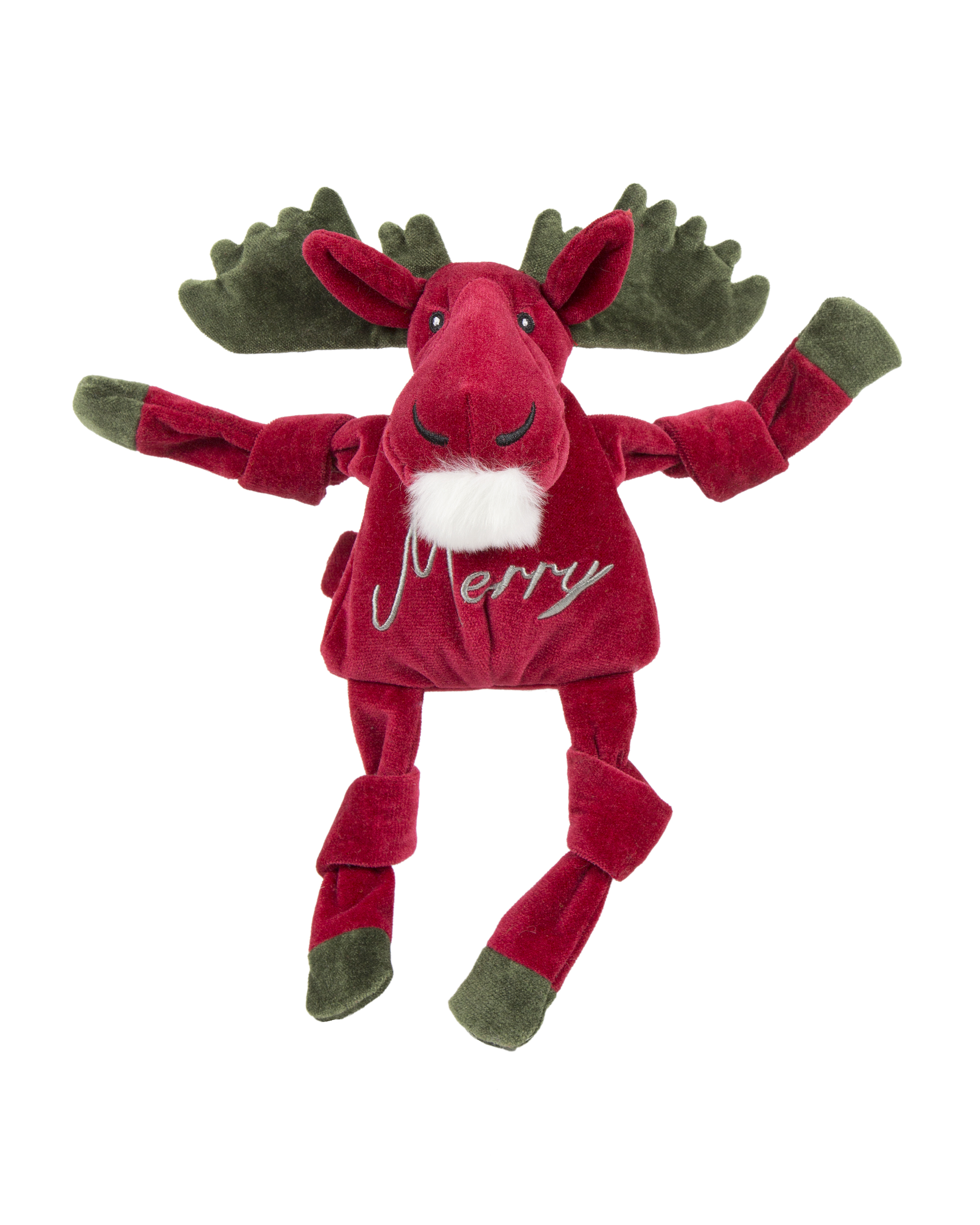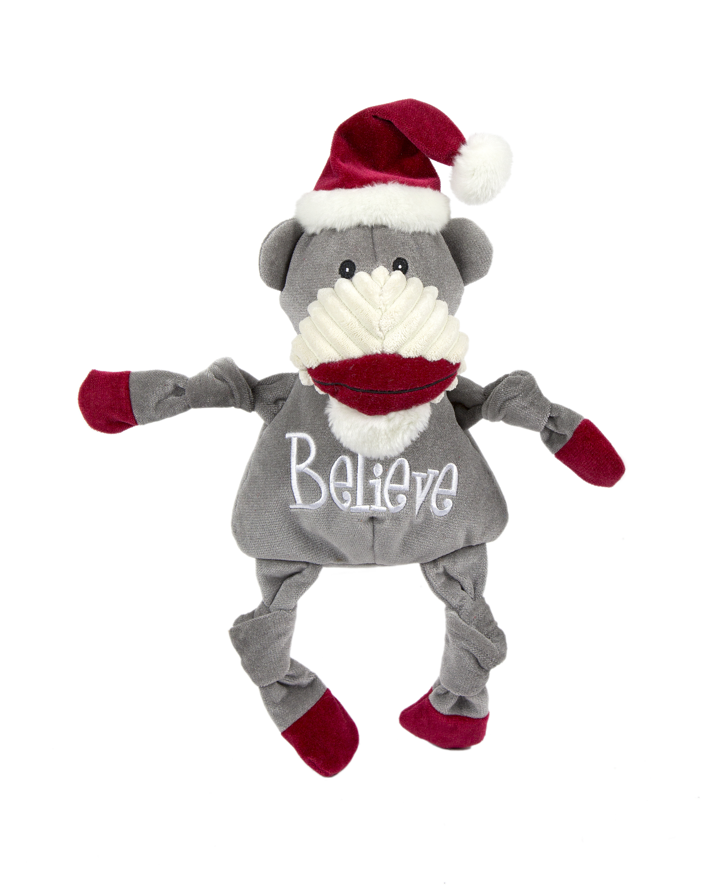 in holiday greetings of Merry, Believe and Jolly. The beautiful colors and detail belie just how tough these toys are. Knotties® are made with our exclusive Tuffut Technology® lining, a durable two-layer process making them the most durable plush toys available. Knots in the limbs for tugging and playing, and embellished with five squeakers(!). The large size is about 15” long, 7” wide, and 5” deep. The small size is about 9” long, 4” wide, and 3” deep. All HuggleHounds plush toys can be machine-washed over and over! MSRP: $19.99-$24.99
